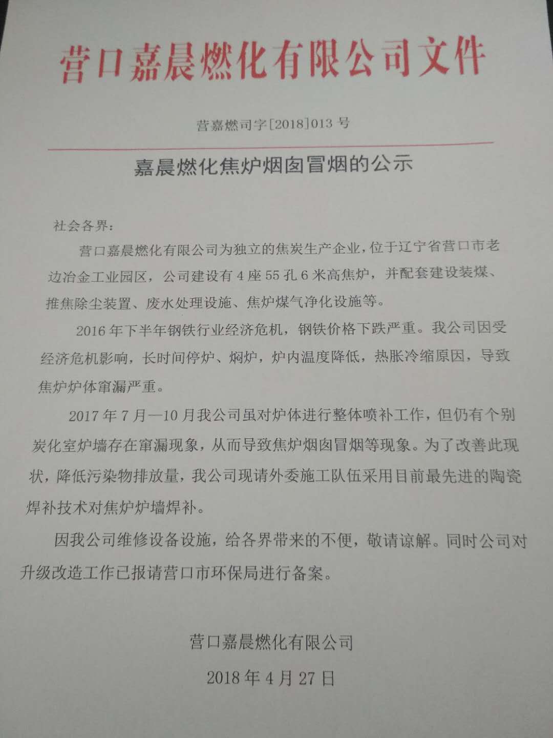 营口嘉晨燃化焦炉烟囱冒烟的公示