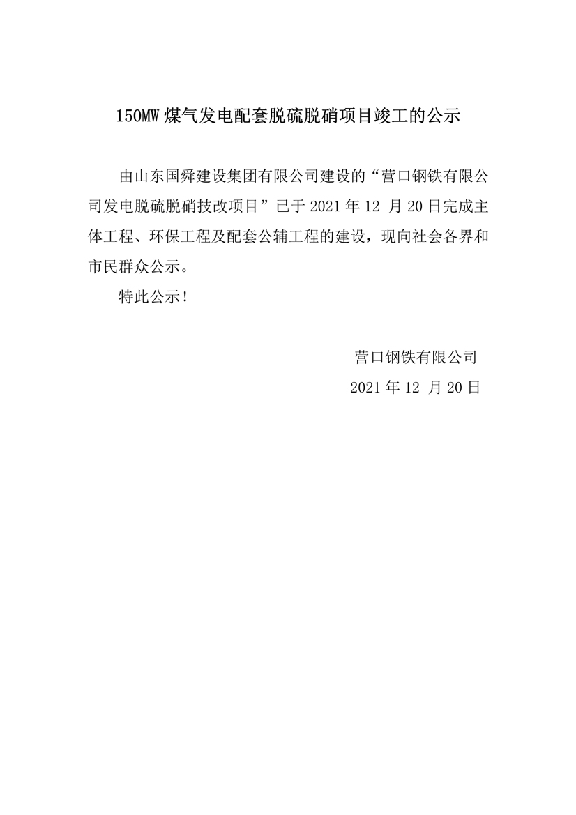 150MW煤气发电配套脱硫脱硝项目竣工的公示